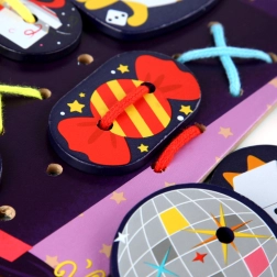 Ten zabawny zestaw do sznurowania i przewlekania z motywem magika zaprasza dzieci do świata fantazji. Na dużej podkładce z głową magika i jego kapeluszem mogą za pomocą sznurówek mocować kolorowe dodatki – od króliczka i monet po tajemnicze karty. Podczas zabawy dzieci ćwiczą koordynację ręka–oko, cierpliwość i twórczość.