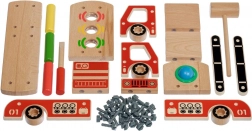 - 17 drewnianych elementów do złożenia auta, śrubki, 1 śrubokręt, 3 kolorowe kołki, 1 kula do wbijania, młotek