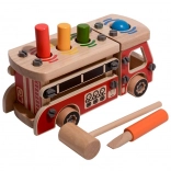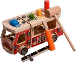 Ten kreatywny zestaw łączy konstrukcję i wbijankę w jednym. Dzieci najpierw złożą solidny drewniany wóz strażacki, a następnie skorzystają z czterech otworów w skrzyni do wesołego wbijania kolorowych elementów młotkiem. Dzięki wyrazistym kolorom i zróżnicowanym kształtom zabawka wspiera naturalną naukę i koncentrację.