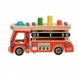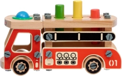 Złóż działający drewniany wóz strażacki ze śrubami i narzędziami. Proces budowy wspiera logiczne myślenie i cierpliwość.