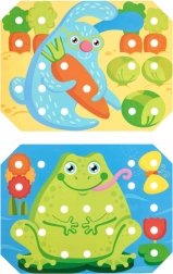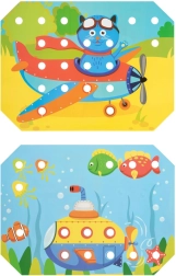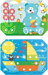 Cztery kolorowe sznurówki i perforowane karty rozwijają koncentrację, wytrwałość i kreatywność podczas tworzenia własnych wzorów.