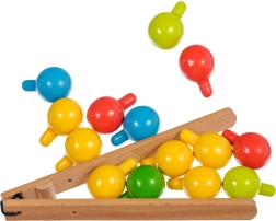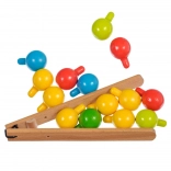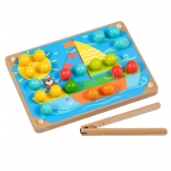 Drewniana podstawa z otworami, kolorowe kołeczki i pęseta motywują dzieci do precyzyjnego chwytu oraz ćwiczą małą motorykę i koordynację oko–ręka.
