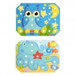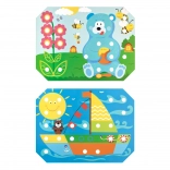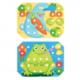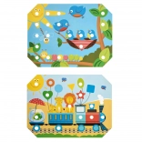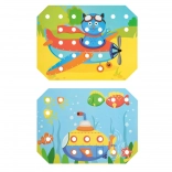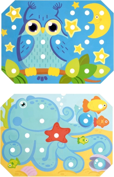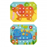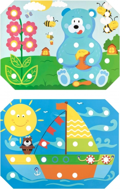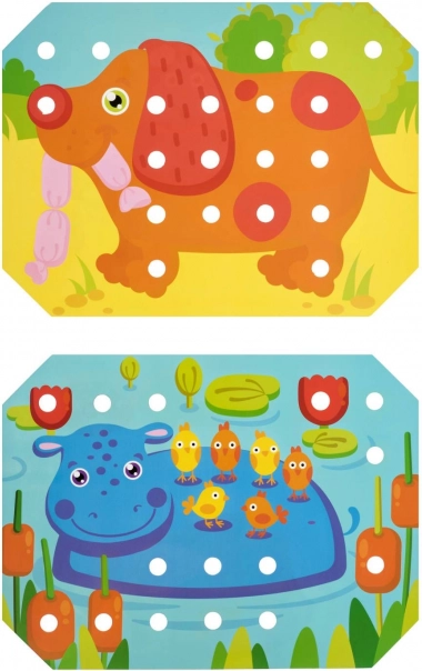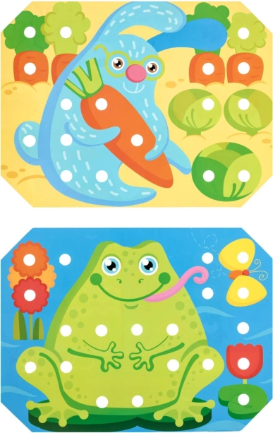 Dzieci wybierają jeden z kolorowych szablonów, układają go na drewnianej podstawie i wypełniają obrazek kołeczkami za pomocą pęsety lub dłoni. Mogą też ćwiczyć sznurowanie i wyszywanie z użyciem dołączonych sznurówek. Zabawa naturalnie wspiera koncentrację, logikę, cierpliwość i precyzję.