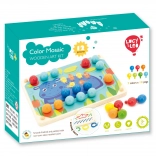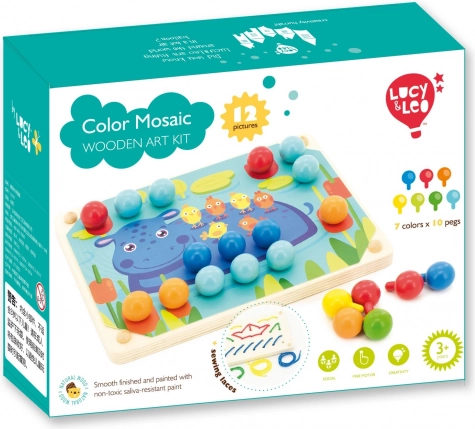 Zestaw oferuje wiele możliwości: układanie mozaiki według szablonów i własnej wyobraźni, sortowanie według kolorów, liczenie kołeczków oraz ćwiczenie chwytu. Po zabawie kołeczki wygodnie trafiają do lnianego woreczka – wszystko jest przejrzyste i gotowe na kolejne tworzenie.