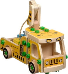 Opakowanie zawiera 16 drewnianych elementów do złożenia dźwigu, śruby, śrubokręt oraz 4 kolorowe klocki przedstawiające ładunek. Zabawka pełni również funkcję pomocy Montessori, która pomaga dziecku skutecznie rozwijać różnorodne umiejętności.