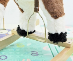 Ten magiczny koń na biegunach jest wykonany z miękkiego i wysokiej jakości pluszu, co gwarantuje przyjemny w dotyku. Wyjątkową cechą są drewniane listwy biegunowe i solidne drewniane uchwyty, które zapewniają stabilność i bezpieczeństwo podczas zabawy. Konik jest wyposażony w siodło ze strzemionami i uzda, co jeszcze bardziej przybliża autentyczność jazdy konnej.