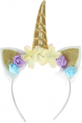 Wygodna opaska z lśniącym rogiem, błyszczącymi uszkami i kolorowymi kwiatami pięknie dopełni kostium jednorożca.