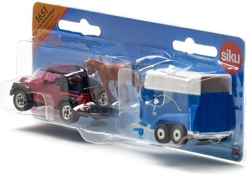 Pojazd typu Jeep ze specjalną przyczepą do transportu koni, wykonany z wysokiej jakości metalowych i plastikowych elementów.