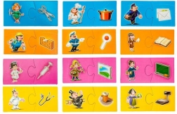 Odkryj świat pracy w zabawny sposób. Dzieci dopasowują kolorowe elementy z obrazkami zawodów do elementów z przedmiotami, które do nich pasują – na przykład kucharza do garnka lub policjanta do znaku drogowego. Gra naturalnie rozwija słownictwo i zrozumienie tego, czym zajmują się różni ludzie.