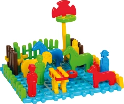 W zestawie znajduje się podkładka 37 × 37 cm, figurki rodziny i zwierzątek oraz różne elementy konstrukcyjne, które inspirują do otwartej zabawy. Dzieci mogą karmić owieczki, prowadzić konie na pastwisko lub „naprawiać” ogrodzenie – możliwości są nieograniczone.