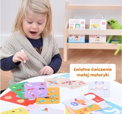 Zestaw zawiera kolorowe ilustracje pełne humoru, które zachęcają dzieci do kreatywnych aktywności. Karty umożliwiają wielokrotne rysowanie i ścieranie, co stanowi świetny edukacyjny prezent dla dzieci w wieku przedszkolnym. Idealny także w podróży z dzieckiem.