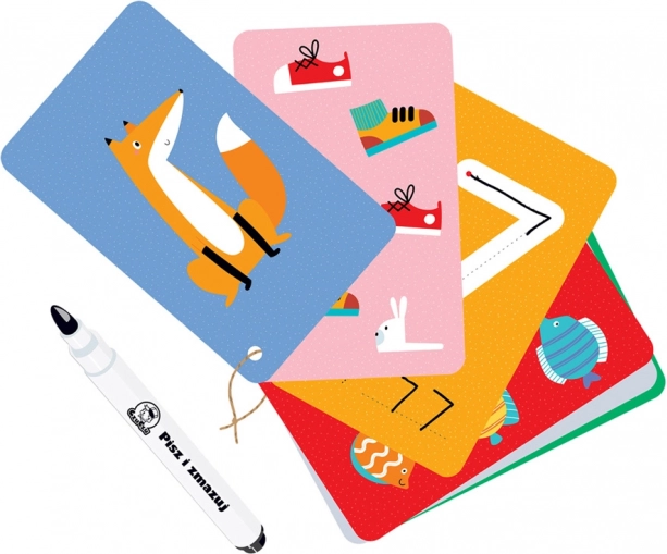 - Karty i suchościeralny mazak umożliwiają wielokrotne pisanie i ścieranie.