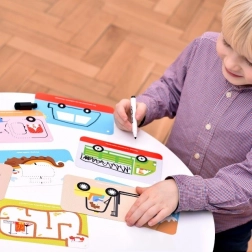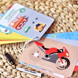 Zestaw CzuCzu Pojazdy oferuje dzieciom mnóstwo sprytnych aktywności z motywami różnych środków transportu. Książeczka na sznurku jest pełna barwnych ilustracji i zadań, które dzięki zmazywalnemu flamastrowi można wykonywać raz po raz. Praktyczne opakowanie z uchwytem świetnie sprawdza się w domu, w odwiedzinach i w samochodzie.