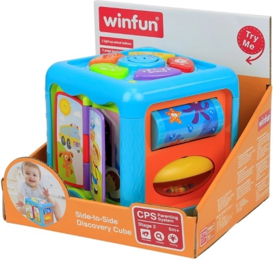 Edukacyjna kostka to wspaniała zabawa, posiada książeczkę z trzema plastikowymi kartami do przewracania, na których znajdują się zabawne historyjki. Podczas przewracania kart maluch usłyszy wesołe melodie i dźwięki. Kolorowe wałeczki – grzechotki z przyjaznymi buziami morskich zwierzątek oraz kolorowe piłeczki zainteresują każde dziecko. Maluch uczy się kolorów za pomocą obrotowego dysku. Rozwija paluszki dzięki „torowi przeszkód” dla motylka, biedronki i pszczółki.