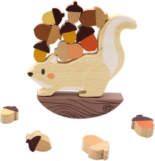 Rozbrykana wiewiórka szykuje się na zimę – czy uniesie wszystkie żołędzie? Zmieniajcie się z przeciwnikiem i układajcie elementy tak, aby wiewiórka na chwiejnym stojaku się nie przechyliła. Proste zasady i dreszczyk emocji przy każdym ruchu sprawiają, że ta drewniana gra balansowa to świetny wybór dla dzieci od 3 lat.