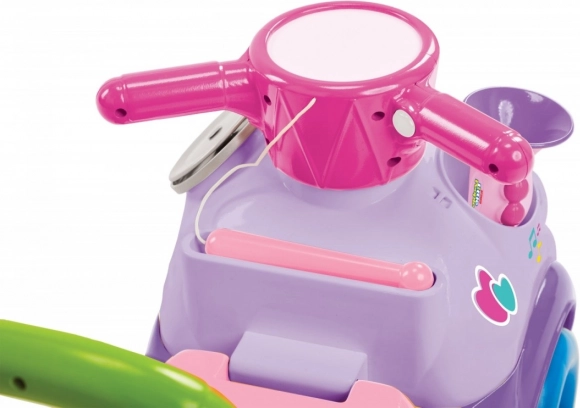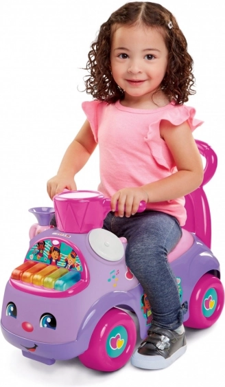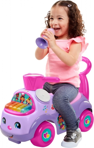 Fioletowy jeździk FISHER-PRICE Muzyczna parada to wszechstronny towarzysz pierwszych przejażdżek i pierwszych kroków. Dzięki tylnej rączce posłuży jako stabilne podparcie przy chodzeniu, a po zajęciu miejsca dziecko odpycha się nóżkami, co naturalnie wzmacnia mięśnie i trenuje równowagę.