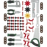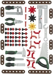 Piłka, młotek, klucze, kombinerki, pilniki, śruby i łączniki – wszystko, czego dziecko potrzebuje do budowania i wkręcania.