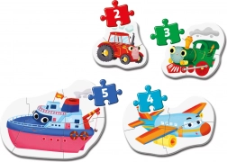 Odkryj zabawny świat układanek dla najmłodszych. Ten zestaw zawiera cztery oddzielne puzzle z motywami różnych środków transportu i stopniowaną trudnością (2, 3, 4 i 5 elementów), aby dzieci mogły stopniowo budować pewność i umiejętności.