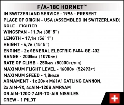 Model jest świetnym prezentem dla fanów lotnictwa i techniki wojskowej w każdym wieku. Dzięki licencjonowanemu wzornictwu doskonale pasuje zarówno do pokoju nastolatka, jak i do reprezentacyjnego biura. Model F/A-18C Hornet zastąpił francuskie Mirage IIIS w szwajcarskich siłach powietrznych od 1992 roku, kiedy zamówiono 34 samoloty w różnych wersjach.