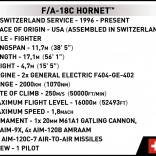 Zanurz się w świecie lotnictwa z modelem F/A-18C Hornet w skali 1:48, zbudowanym z 540 klocków. Ten model jest wierną kopią szwajcarskiego myśliwca z wysokiej jakości nadrukami i wieloma ruchomymi elementami, w tym składanym podwoziem i obracanymi kołami. Dodatkowo oferuje uzbrojenie pod skrzydłami oraz specjalny klocek do umieszczenia pilota w kokpicie.