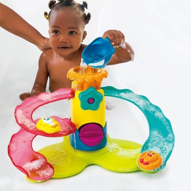 Odkryj świat zabawy z dziecięcym aqua parkiem do wanny z dwiema zjeżdżalniami i ruchomymi elementami dla rozrywki podczas kąpieli.
