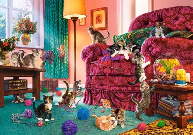 Puzzle przedstawiają przytulny salon pełen rozbrykanych kociąt i kolorowych kłębków wełny.