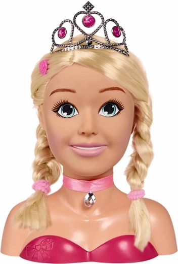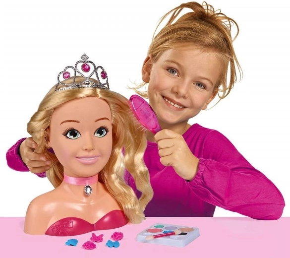 Ta czarująca głowa do stylizacji z długimi blond włosami i różową wstążką z kryształkiem jest idealna dla małych fryzjerek i wizażystek. Dzięki zestawowi akcesoriów – od srebrnej korony po szczotkę, spinki, gumki oraz paletkę z kosmetykami – dzieci łatwo stworzą bajkowe fryzury i delikatny makijaż.