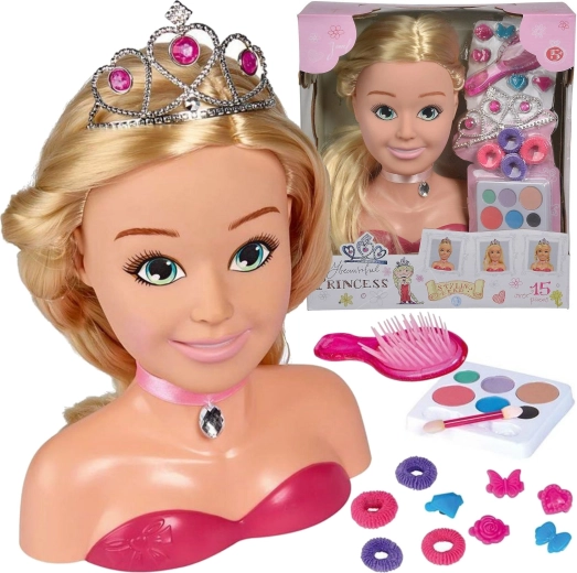 - Głowa do stylizacji PRINCESS, korona, szczotka, 5 spinek, gumki, paletka do makijażu z aplikatorem