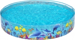 Duży okrągły rozkładany basen BESTWAY jest idealny do ogrodu lub na działkę. Konstrukcja stabilizuje się sama po napełnieniu, a solidne PVC ściany wytrzymują codzienne użytkowanie. Morska grafika z delfinami i rybkami od razu zachwyci dzieci. Basen łatwo wyczyścisz, złożysz i przechowasz na kolejny sezon.