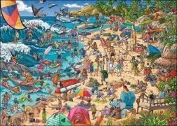 Ułożona układanka ma wymiary około 70 x 50 cm i jest idealna do wspólnych chwil rodzinnych lub relaksu w samotności. Zanurz się w żywej atmosferze plaży, gdzie ludzie cieszą się surfowaniem, pływaniem i odpoczynkiem w słoneczny dzień.