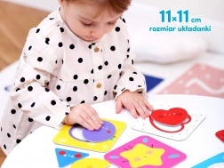 Pierwsze puzzle–sorter kształtów dla najmłodszych od 18 miesięcy rozwijają małą motorykę, logiczne myślenie i percepcję kolorów. Duże plansze z wyjmowanymi elementami oferują tylko jedno prawidłowe dopasowanie, dzięki czemu dziecko uczy się metodą prób i błędów bez frustracji. Duże, bezpieczne elementy, barwne ilustracje i edukacyjna zabawa na każdy dzień.