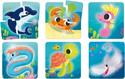 Ten zestaw zawiera 6 ilustrowanych kartoników z morskimi zwierzętami, z których każdy składa się z 4 dużych elementów. Dzięki nasyconym kolorom i prostym kształtom dzieci łatwo się orientują i szybko rozumieją zasadę układania. Wielkość elementów jest dostosowana do małych rączek i wspiera koordynację ręka–oko.