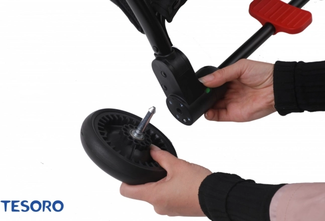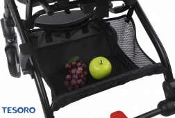 - Łatwe składanie jednym przyciskiem – po złożeniu wózek stoi na kołach i można go przechowywać na płasko.