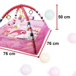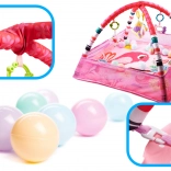 Mata jest solidna i trwała, zaprojektowana tak, aby wytrzymać długotrwałe użytkowanie. Zawieszone zabawki i pastelowe piłeczki przyczyniają się do rozwoju zmysłów.