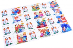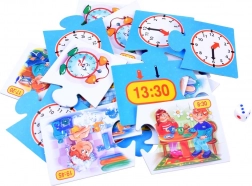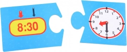 Zestaw zawiera 24 elementy, które tworzą 12 par. Każda para składa się z dwóch puzzli – jednego z zegarem wskazówkowym i drugiego z zegarem cyfrowym, pokazujących tę samą godzinę.