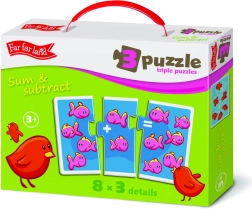 Twoje dzieci będą się bawić i uczyć z puzzlami Far Far Land, które łączą w sobie formę zabawy i edukacyjne elementy. Każdy z obrazków w zestawie ma proste zadania na dodawanie i odejmowanie, co pomaga rozwijać ich umiejętności matematyczne.