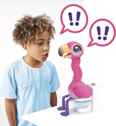 Poznaj różowego flaminga, który rozśmieszy każde dziecko. Uwielbia karmienie specjalnym piaskiem Aqua, po którym musi szybko wyskoczyć do toalety – to zabawne „kupkowanie” jest bezpieczne, a piasek można wykorzystać ponownie. Flaming lubi też pogawędki, powtarza to, co słyszy, a do tego zaprezentuje śpiew i taniec.