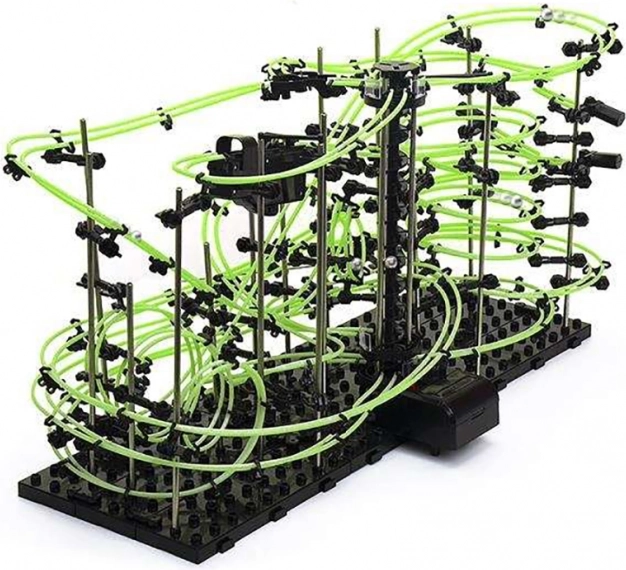 Po złożeniu obserwuj, jak metalowe kulki pędzą w dół i wracają spiralną windą z powrotem na start. W ciemności tor rozświetla się, więc każdy przejazd wygląda imponująco. Pokaż rodzinie i znajomym w praktyce podstawowe zasady fizyki – prędkość, grawitację i siłę odśrodkową.