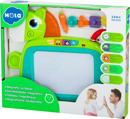 Magnetyczna tablica HOLA to świetny wybór dla rozwoju kreatywności i motoryki małej. Dzięki czterem kolorowym strefom powstają obrazki w barwach, które podobają się dzieciom. Jednym ruchem suwaka wyczyścisz powierzchnię i będzie gotowa na kolejne pomysły. Kształt konika z świecącą grzywą i wesołymi dźwiękami zachęca dzieci do zabawy.