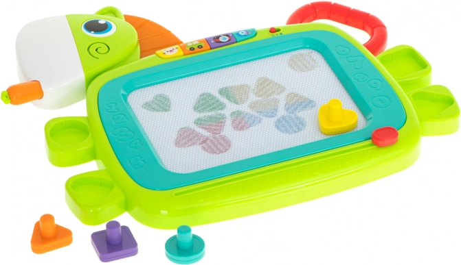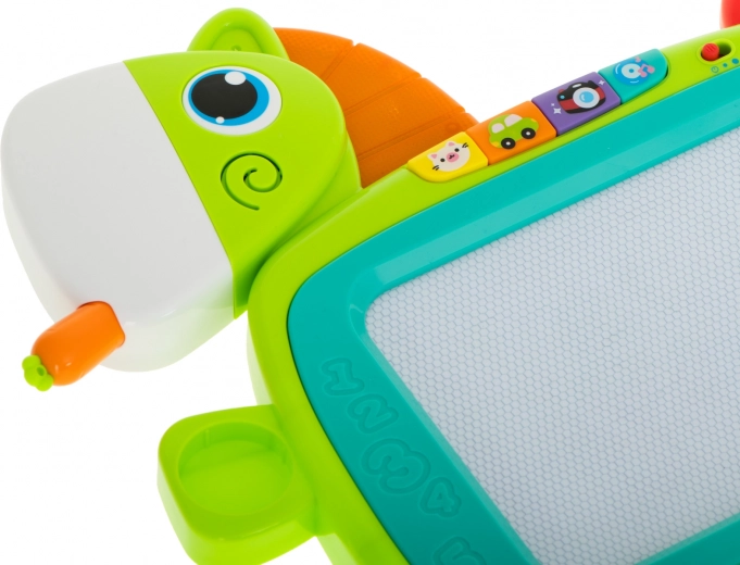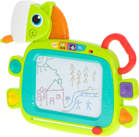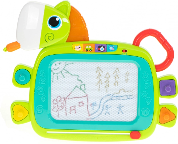 Interaktywne elementy oferują dźwięki zwierząt, dźwięki pojazdów, dźwięki domowe oraz wesołe melodie. Zabawka ma 2 poziomy głośności oraz możliwość całkowitego wyciszenia. Rysik w kształcie marchewki podczas wsuwania do „pyszczka” konika wydaje efekt chrupania. Krawędzie tablicy zdobią wypukłe litery i cyfry – idealne do pierwszego poznawania kształtów.