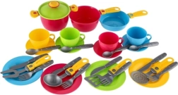 Ten kolorowy zestaw naczyń do dziecięcej kuchni jest idealny do zabawy w gotowanie, serwowanie i wspólne „herbatki”. Solidny plastik i zaokrąglone kształty są przyjazne dla dzieci, a żywe kolory pobudzają wyobraźnię i współpracę.
