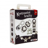 Opakowanie zawiera cztery produkty: zawieszaną barierkę/łańcuch do wózka z klipsami, łączone teksturo­wane oczka i haczyki do mocowania zabawek, miękki gryzak na ulgę przy ząbkowaniu oraz elementy grzechotkowe do sensorycznego odkrywania. Wszystko wykonane z bezpiecznych dla zdrowia materiałów, bez ostrych krawędzi i małych odłączalnych części, które mogłyby być niebezpieczne.