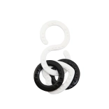 Łączone silikonowe oczka z reliefem masują dziąsła, wspierają zmysł dotyku i ułatwiają chwytanie. Haczyki w kształcie S przymocują zabawki do wózka lub fotelika samochodowego.