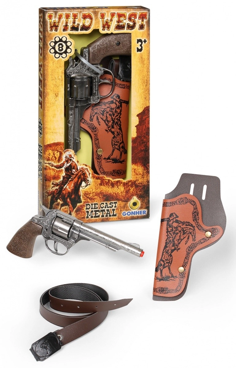 Poczuj klimat Dzikiego Zachodu z wysokiej jakości metalowym rewolwerem marki GONHER. Realistyczne wykończenie, przyjemna waga i niezawodny mechanizm na 8 nabojów sprawiają, że ta zabawka to świetny dodatek do zabaw w Indian i kowbojów oraz stylowy element kolekcji.