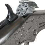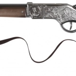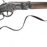 Ta stylowa strzelba z przeładowaniem dźwignią łączy metalowy korpus z „drewnianą” kolbą i bogatymi dekoracyjnymi grawerunkami. Dzięki solidnej metalowej konstrukcji idealnie nadaje się do częstej zabawy i świetnie pasuje do dziecięcych westernowych przygód. Pomarańczowa końcówka lufy wyraźnie sygnalizuje, że to zabawka.