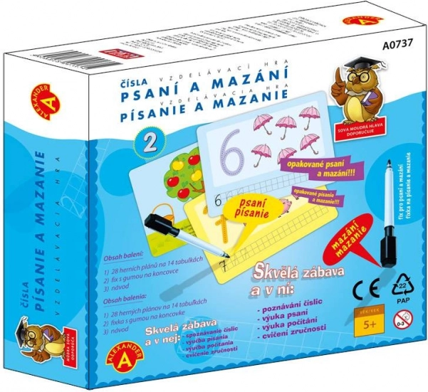 - 14 dwustronnych tablic (28 motywów), ścieralny marker z gąbeczką, instrukcja po czesku i słowacku