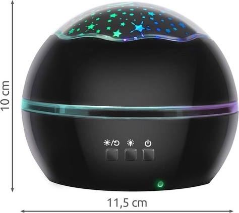 Obracająca się projekcja oraz wybór czterech kolorów (zielony, niebieski, biały, czerwony) tworzą efektowne iluminacje na suficie i ścianach.