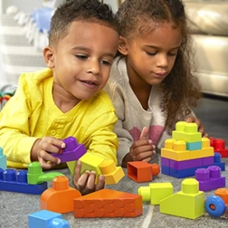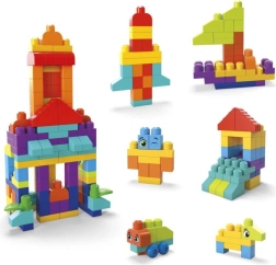 W opakowaniu znajdziesz 150 dużych klocków, w tym specjalne elementy: podstawę z kółkami do pojazdów, klocki z oczami do zabawnych postaci, listki do motywów przyrodniczych oraz elementy dachu do budowli. Wszystko jest w pełni kompatybilne z innymi zestawami MEGA BLOKS, więc zestaw można dowolnie rozbudowywać.