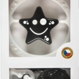 Praktyczny czarno-biały zestaw grzechotek dla niemowląt łączy łańcuszek do wózka oraz osobną grzechotkę w kształcie gwiazdki lub kwiatuszka. Kontrastowe kolory wspierają percepcję wzrokową, a delikatny dźwięk i bezpieczne kształty rozwijają motorykę i zmysły dziecka. Grzechotki są zaprojektowane do wygodnego chwytania i spełniają rygorystyczne normy higieniczne. Bez ostrych krawędzi, bez małych odłączalnych elementów, idealne do codziennej zabawy w domu i w podróży.