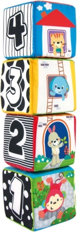 - 4 miękkie klocki z tekstylną powierzchnią i piankowym wypełnieniem dla bezpiecznej zabawy.
